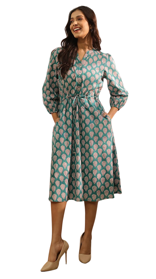 Vestido largo estampado con manga. Verde