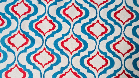 Mantel redondo 100% algodón estampado a mano. Grecas rojo y azul