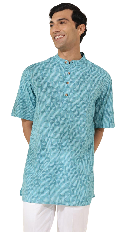 Kurta para hombre. Estampada azul verdoso. Manga corta
