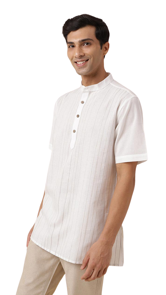 Kurta para hombre. Blanca, Pespunte vertical. Manga larga