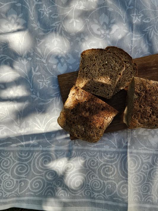 Mantel rectangular 100% algodón estampado a mano. Protea en blanco