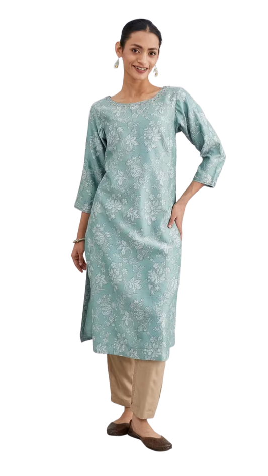 Kurta larga de seda y algodón estampada. Turquesa PREVENTA