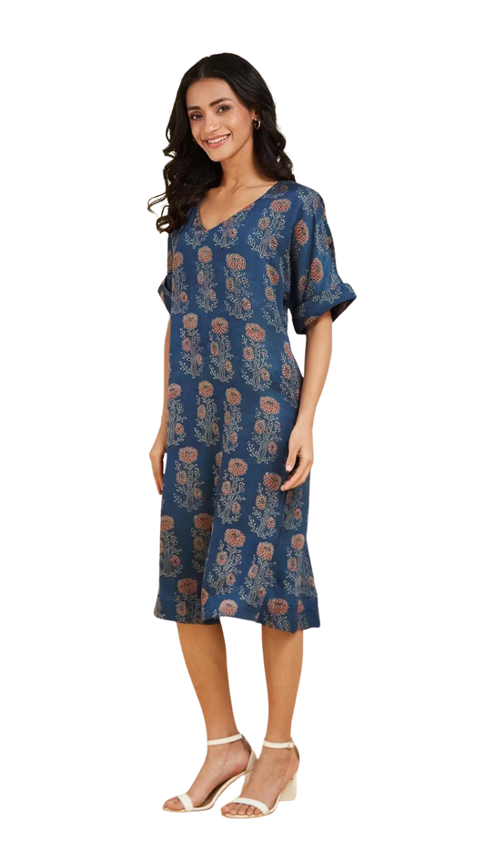 Vestido largo Ajrakh. Manga al codo . Azul y rojo PREVENTA