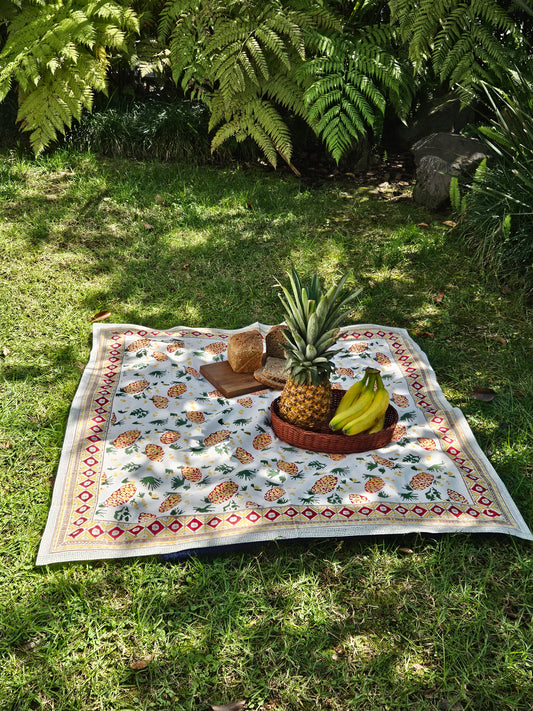 Mantel cuadrado 100% algodón estampado a mano. Piñas en blanco
