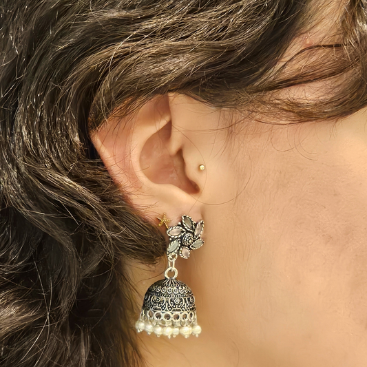 Aretes tradicionales Jhumka metálica. Flor con cuentas blancas