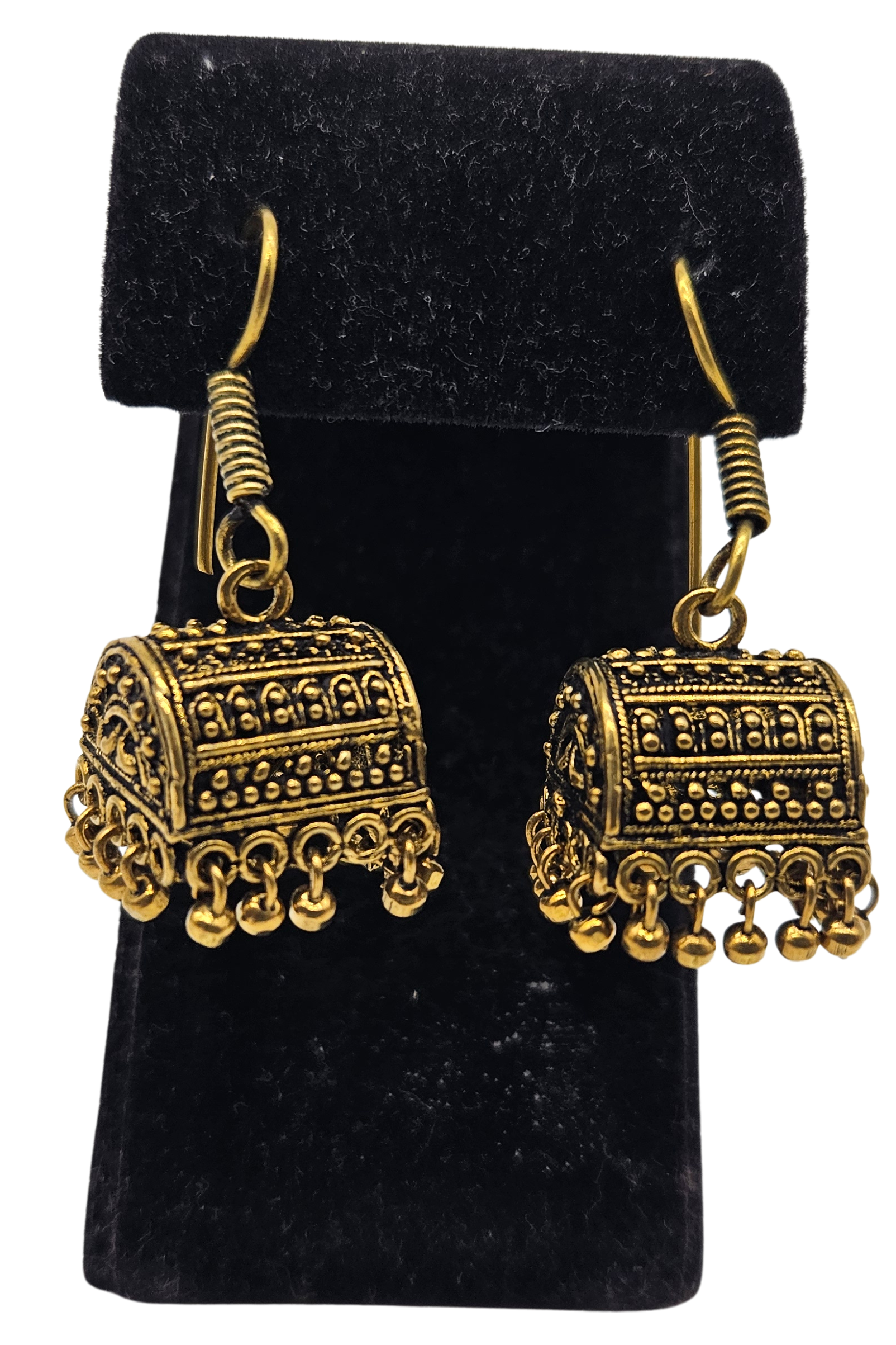 Aretes tradicionales Jhumka metálica. Cofre dorado