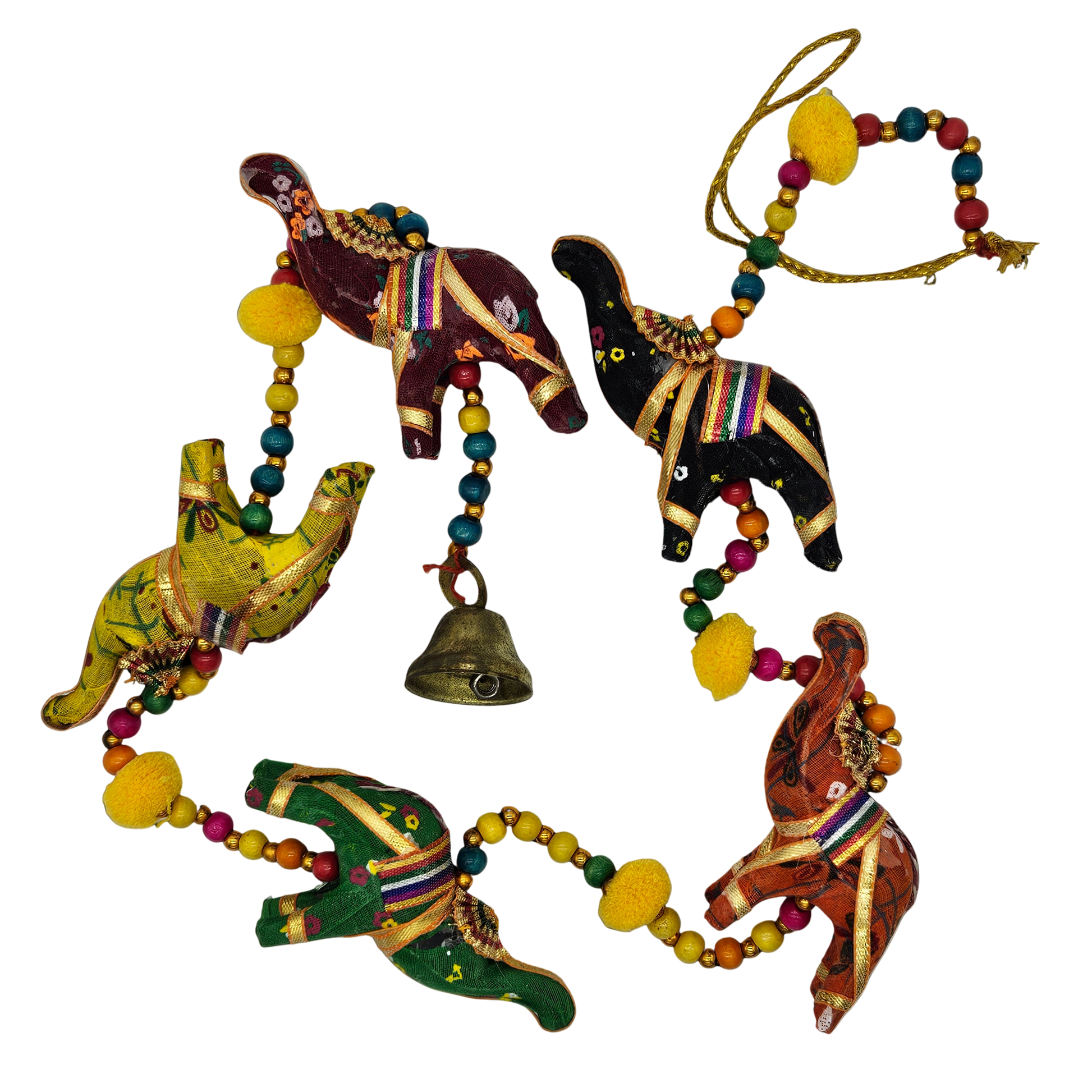 Este colgante está hecho a mano por los artesanos del desierto del Rajasthán. Sus vivos colores alegrarán cualquier espacio incluyendo un cuarto infantil. Se puede colgar detrás de una puerta o en una ventana. Las piezas están forradas de tela y tiene un sinfín de cuentas de color.