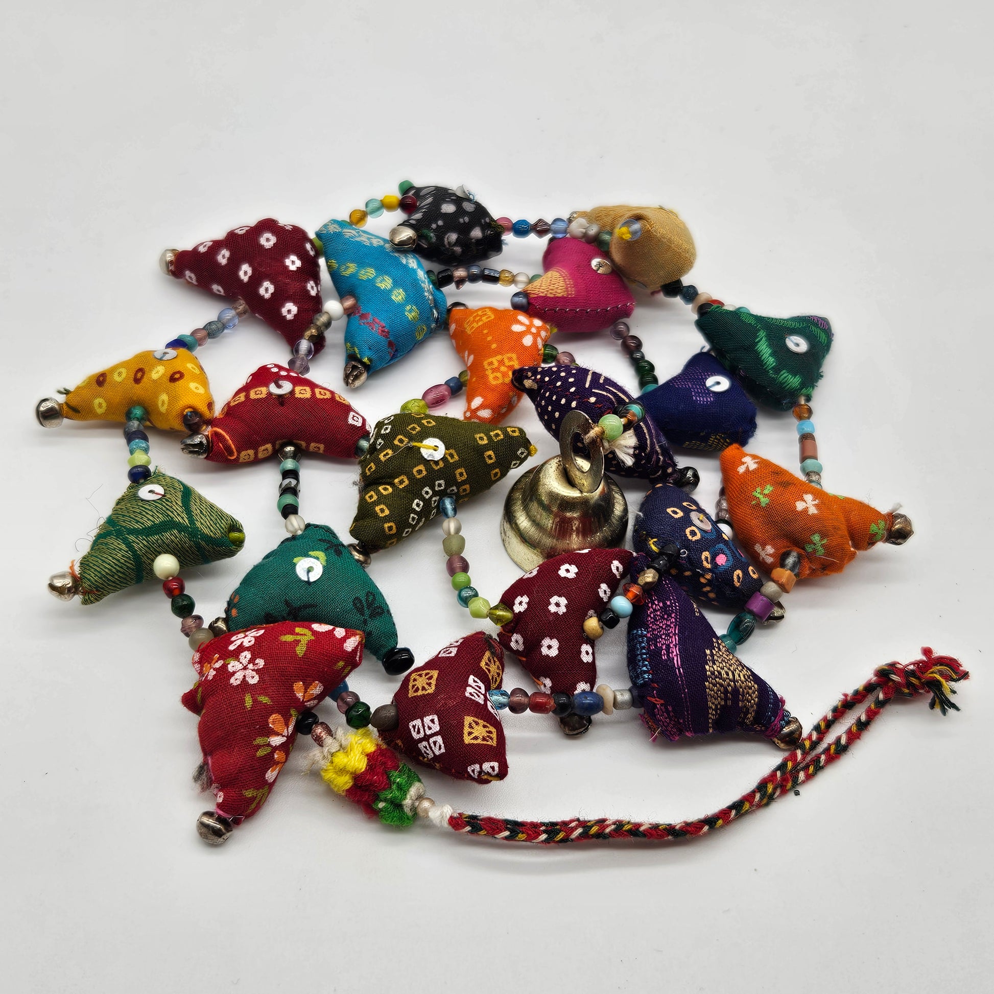 Este colgante está hecho a mano por los artesanos del desierto del Rajasthán. Sus vivos colores alegrarán cualquier espacio incluyendo un cuarto infantil. Se puede colgar detrás de una puerta o en una ventana. Las piezas están forradas de tela y tiene un sinfín de cuentas de color.