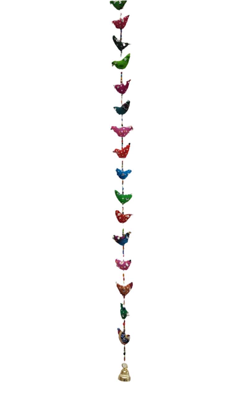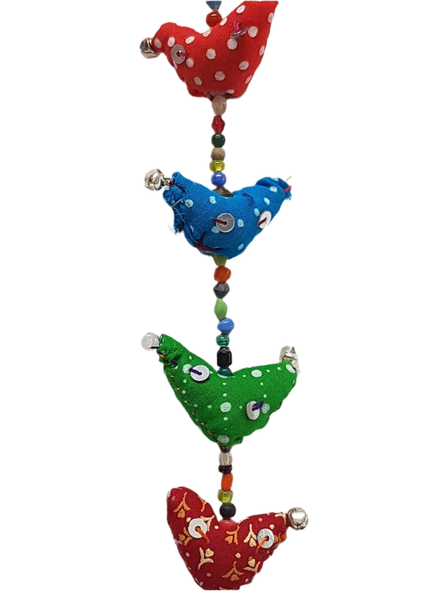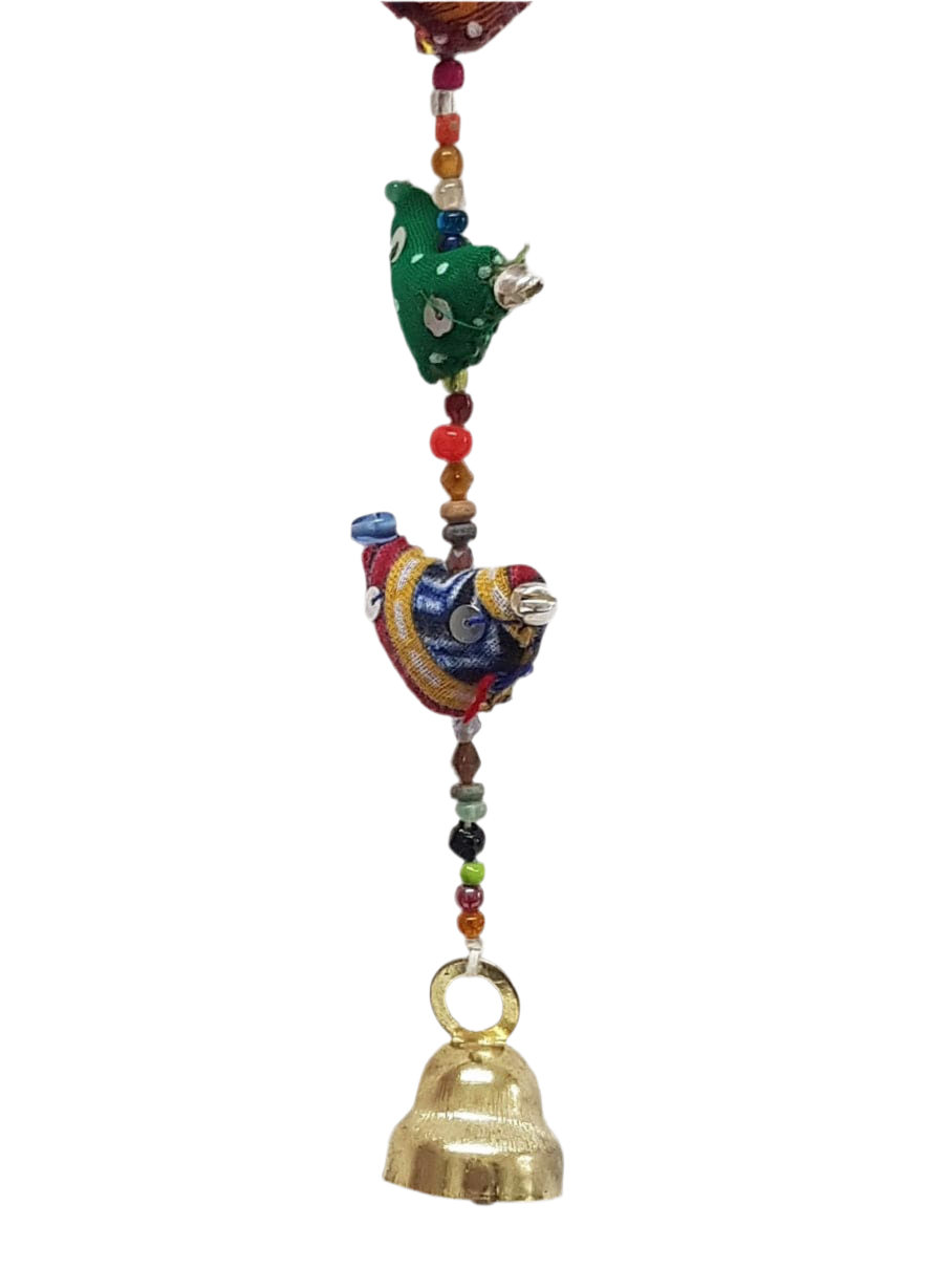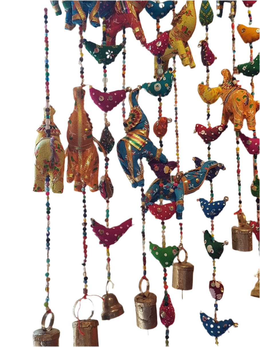 Este colgante está hecho a mano por los artesanos del desierto del Rajasthán. Sus vivos colores alegrarán cualquier espacio incluyendo un cuarto infantil. Se puede colgar detrás de una puerta o en una ventana. Las piezas están forradas de tela y tiene un sinfín de cuentas de color.