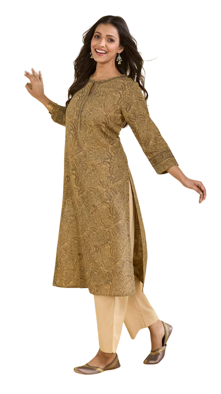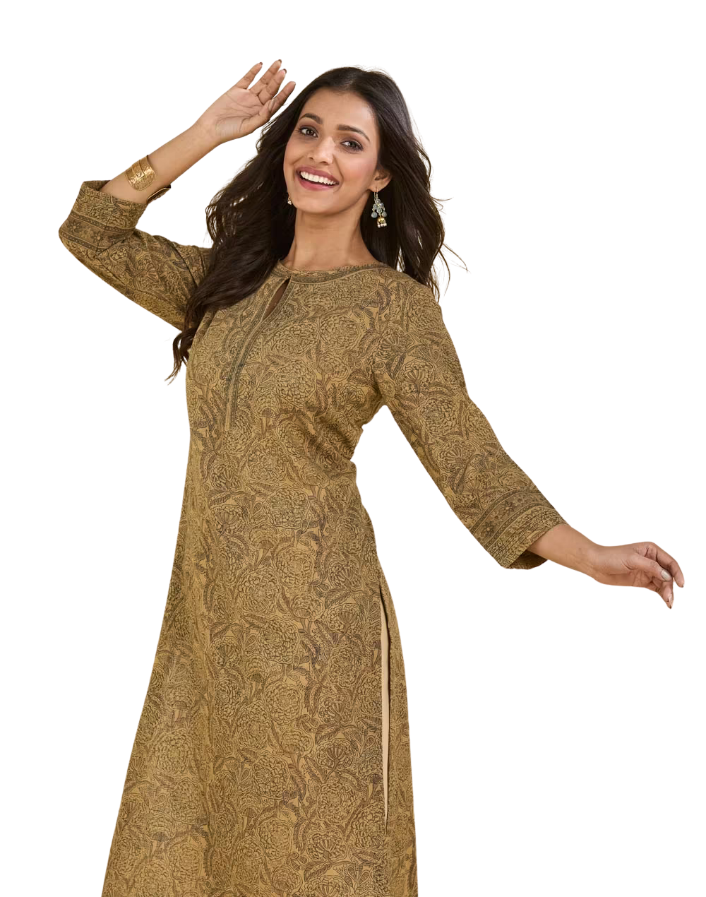 Esta kurta larga está confeccionada en 100% algodón natural, lo que la hace suave y fresca. Su diseño destaca por un estampado floral delicado, realizado completamente a mano con sellos de madera, una técnica tradicional india conocida como block print.