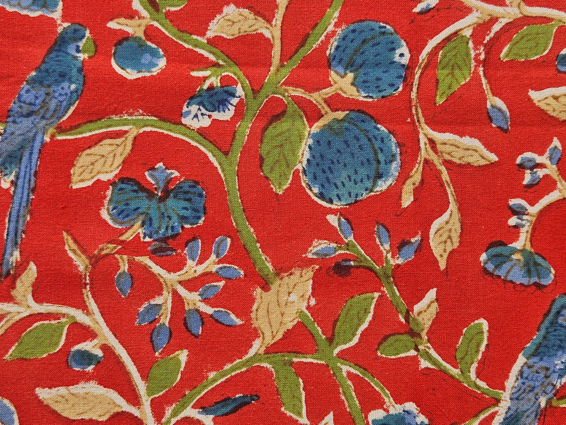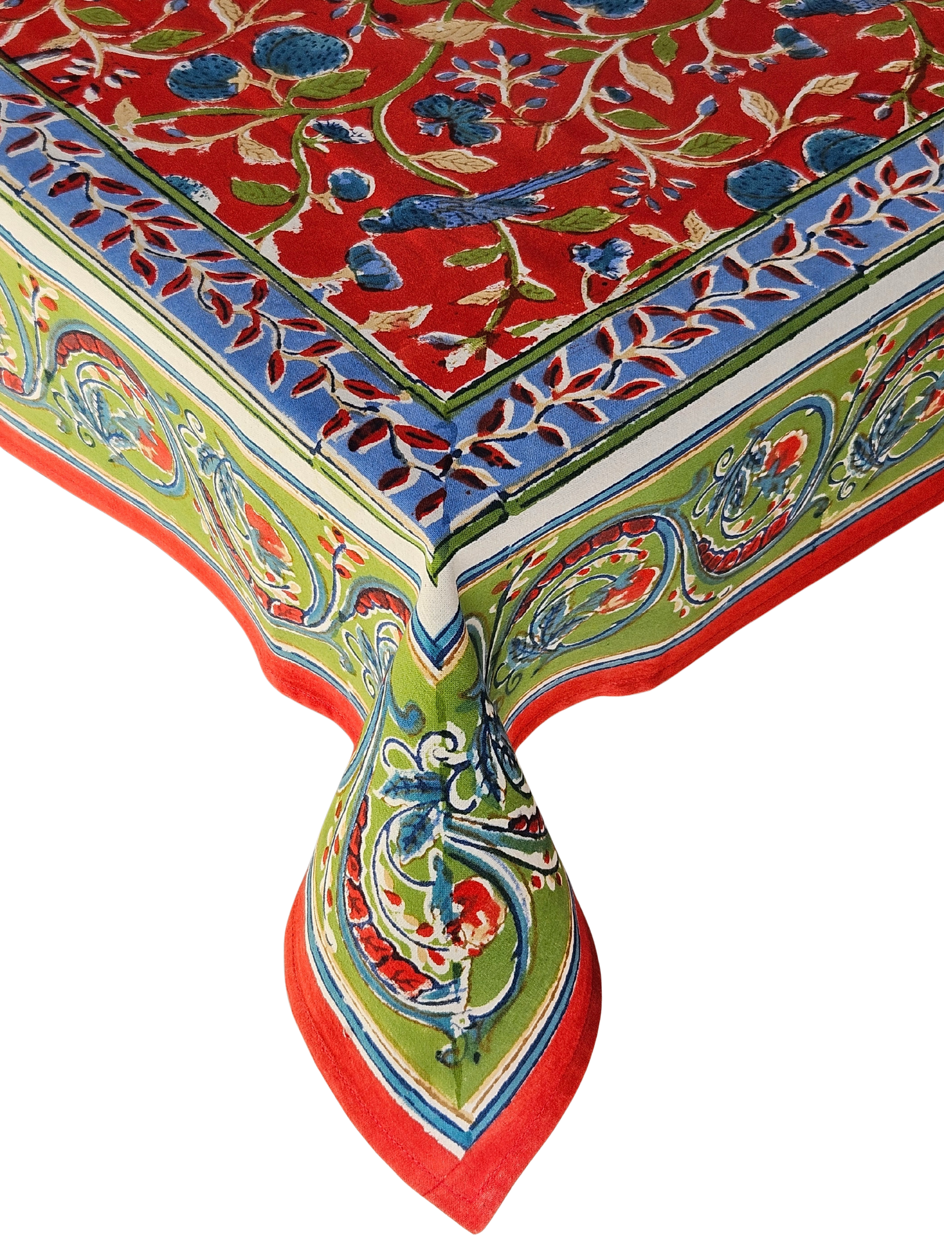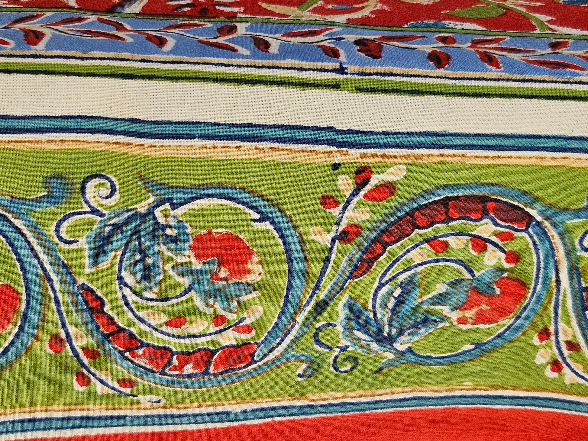 Precioso mantel estampado a mano con brillantes colores. Este mantel está estampado usando la antigua técnica de sellos de madera. El trabajo es completamente a mano y sigue una tradición de más de 4000 mil años. Un arte en extinción cuyos resultados son únicos y espectaculares.