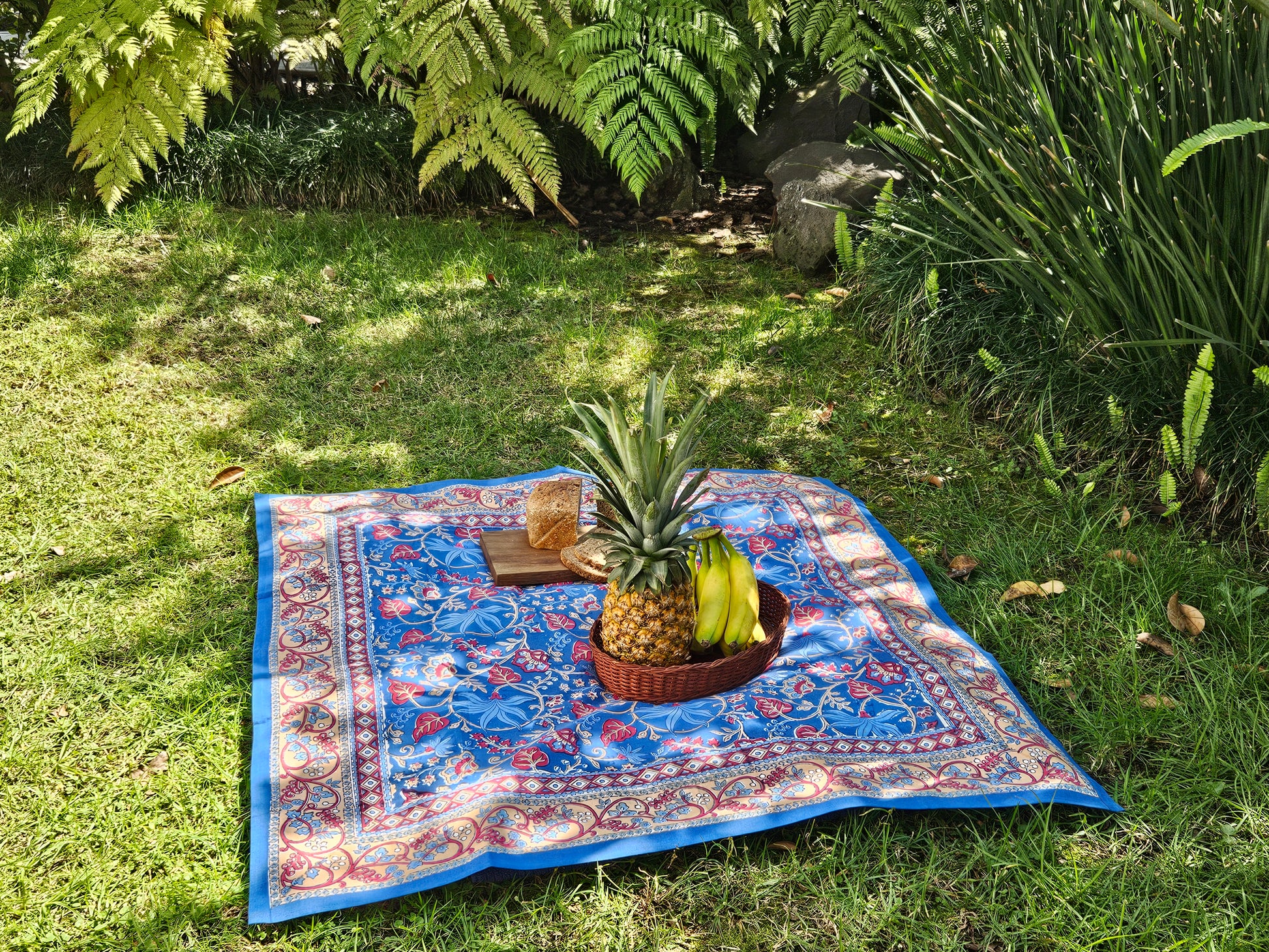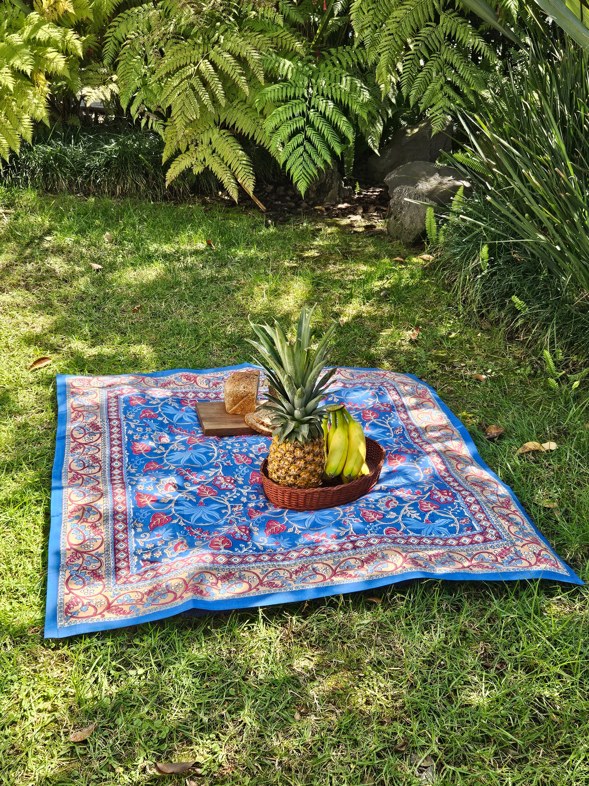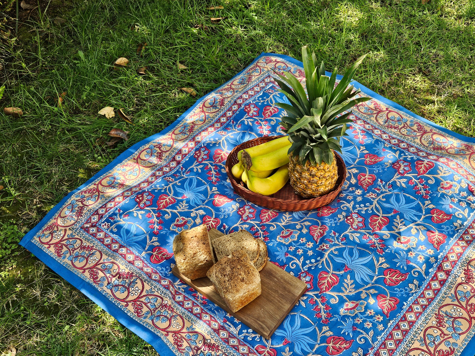 Mantel cuadrado 100% algodón estampado a mano. Ivy azul