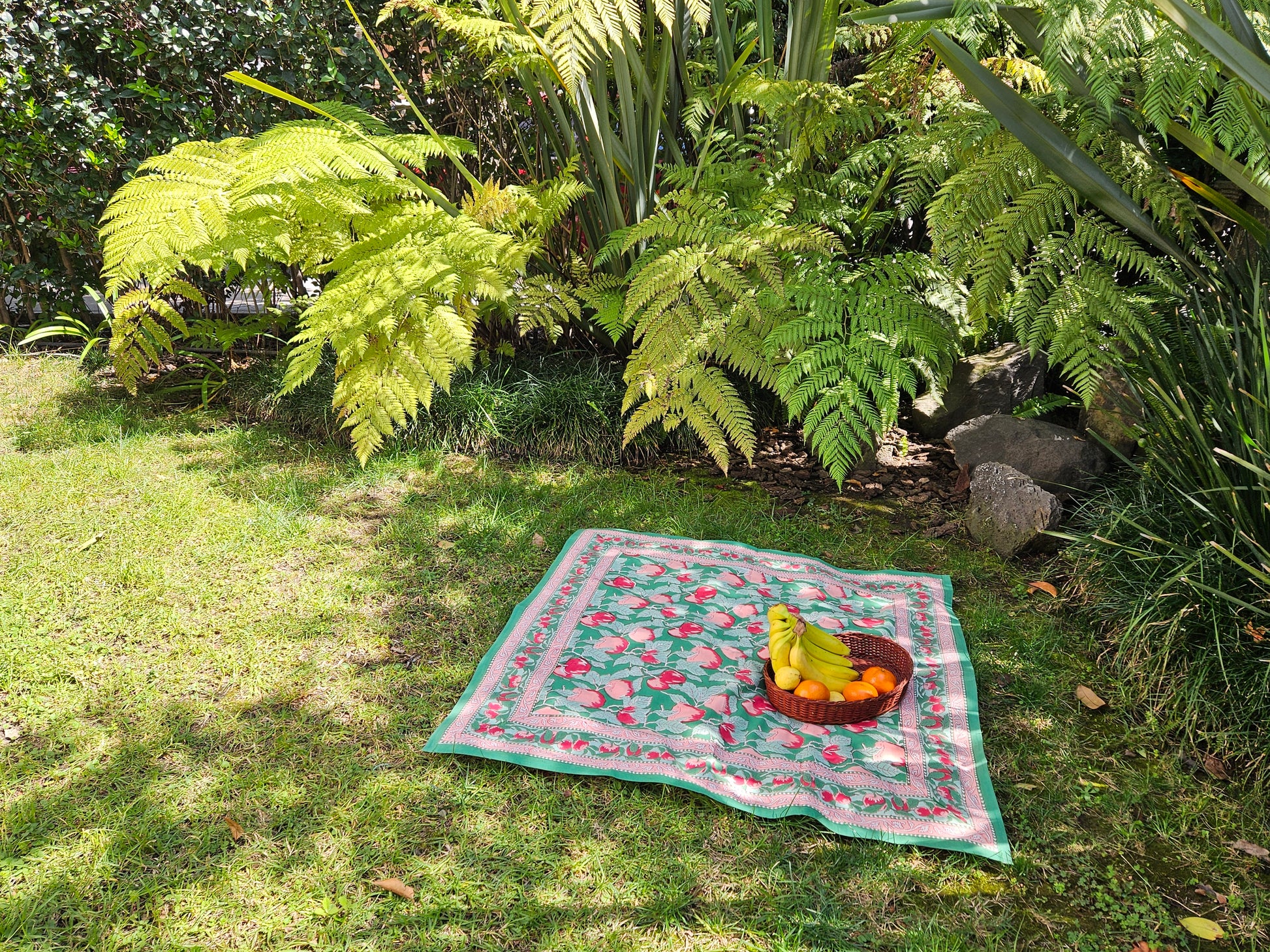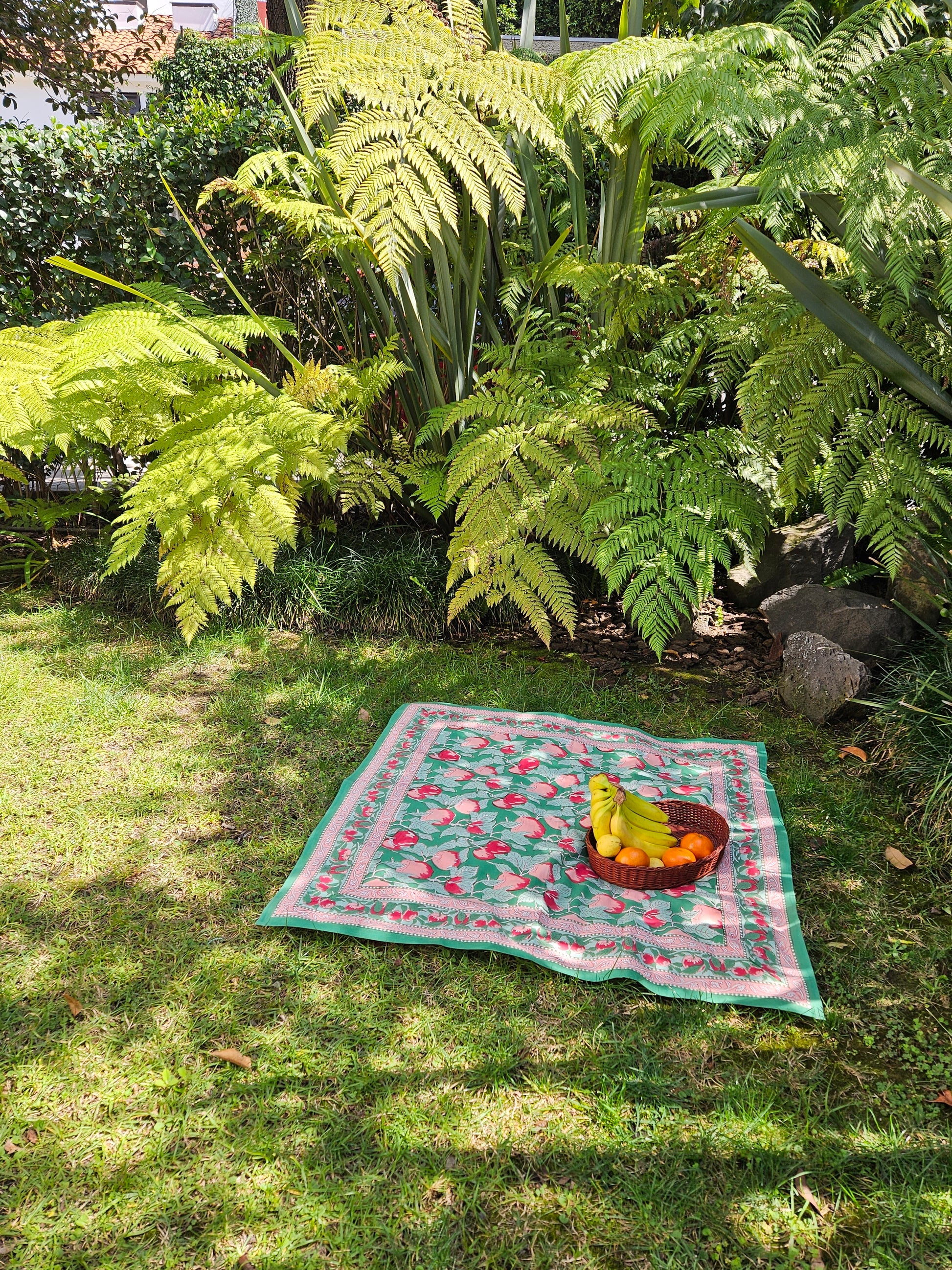 Precioso mantel estampado a mano con brillantes colores. Este mantel está estampado usando la antigua técnica de sellos de madera. El trabajo es completamente a mano y sigue una tradición de más de 4000 mil años. Un arte en extinción cuyos resultados son únicos y espectaculares.