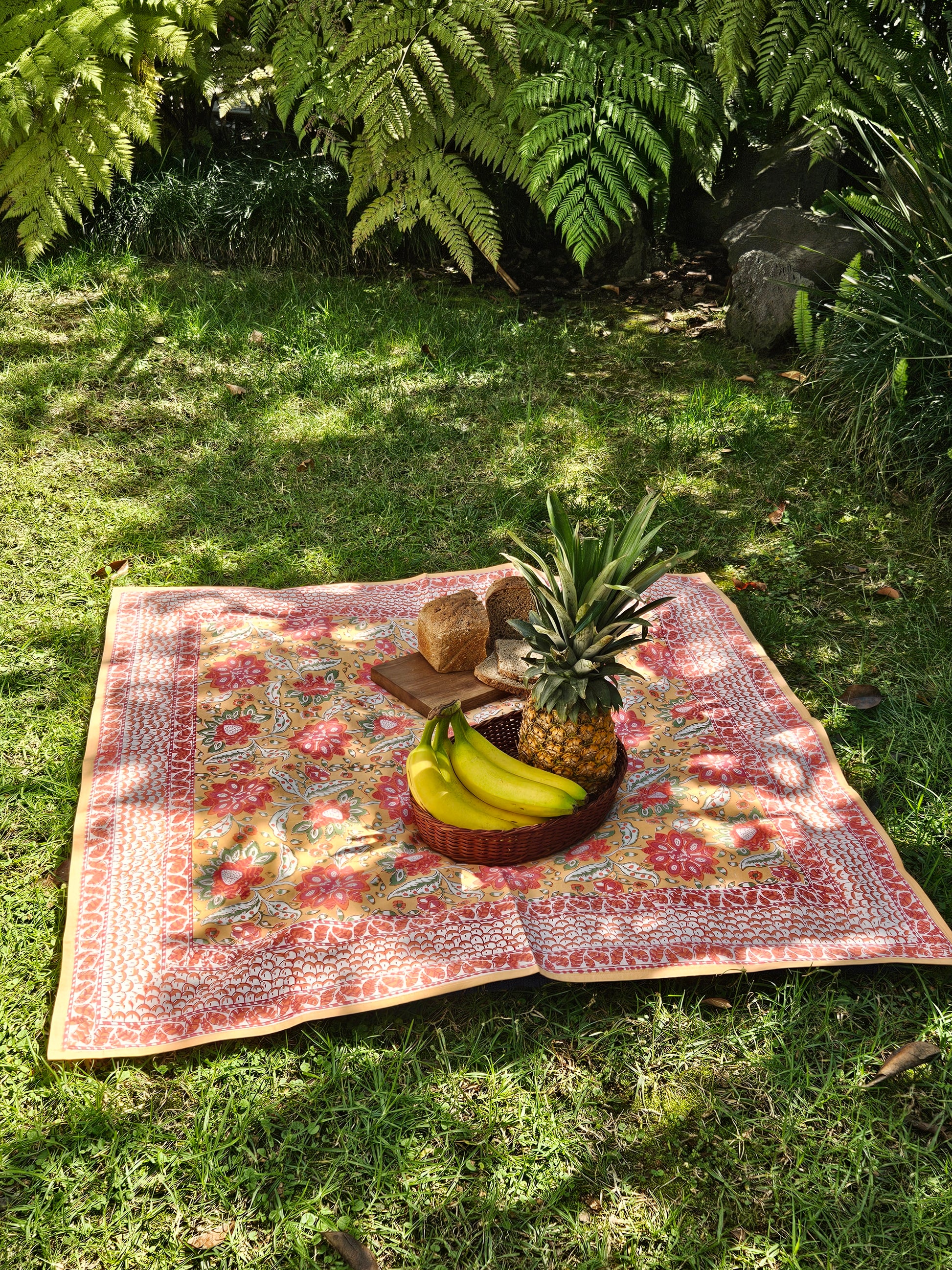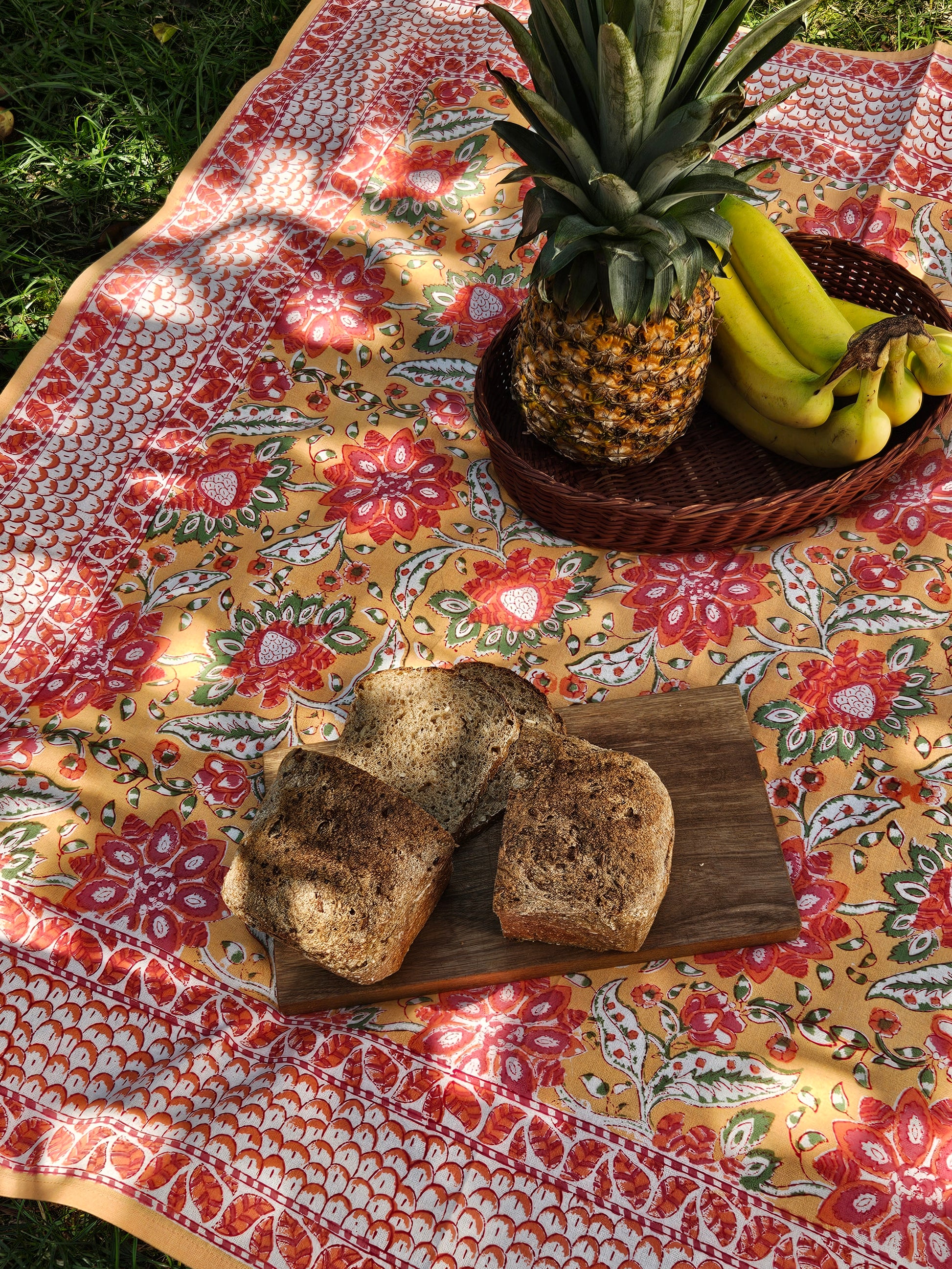Precioso mantel estampado a mano con brillantes colores. Este mantel está estampado usando la antigua técnica de sellos de madera. El trabajo es completamente a mano y sigue una tradición de más de 4000 mil años. Un arte en extinción cuyos resultados son únicos y espectaculares.