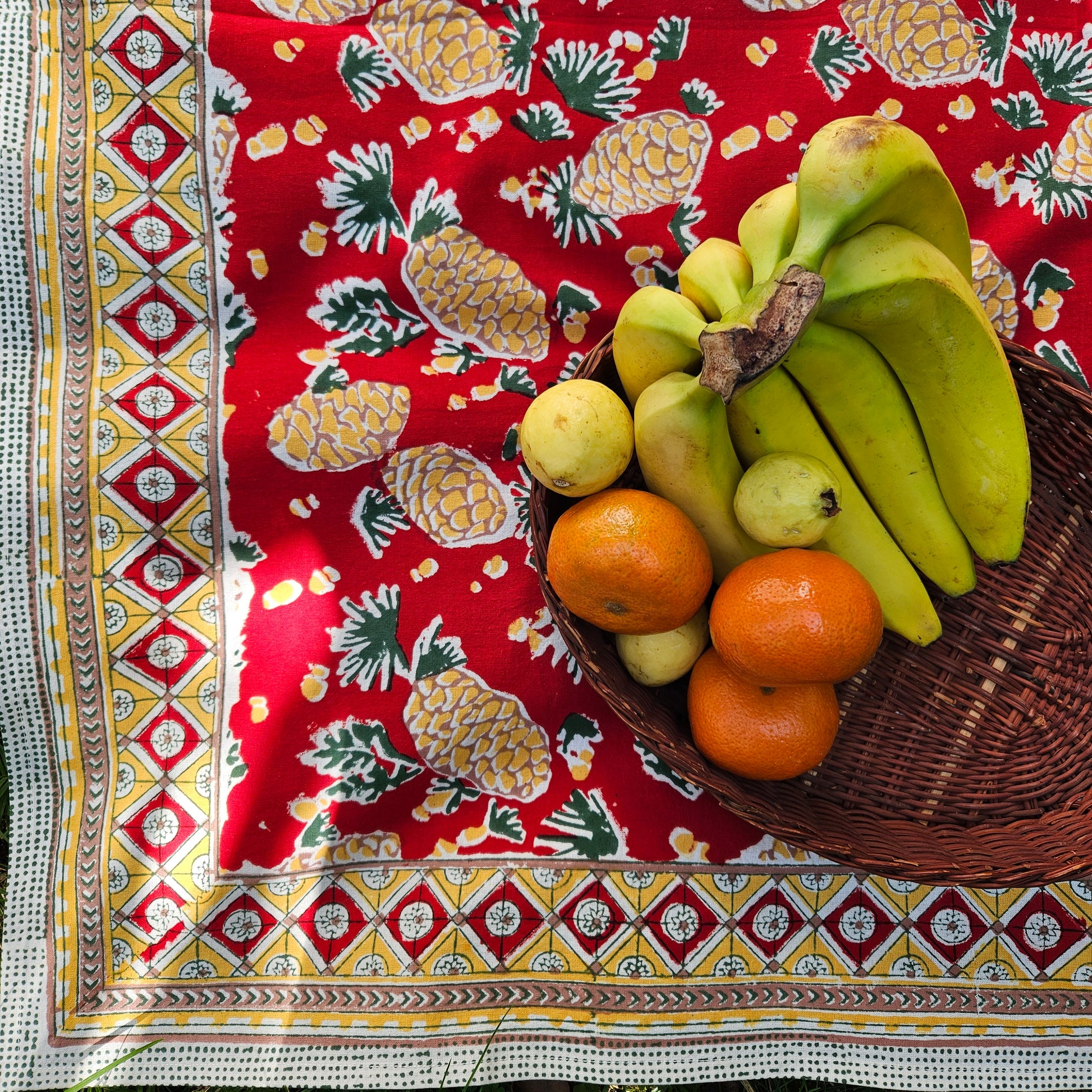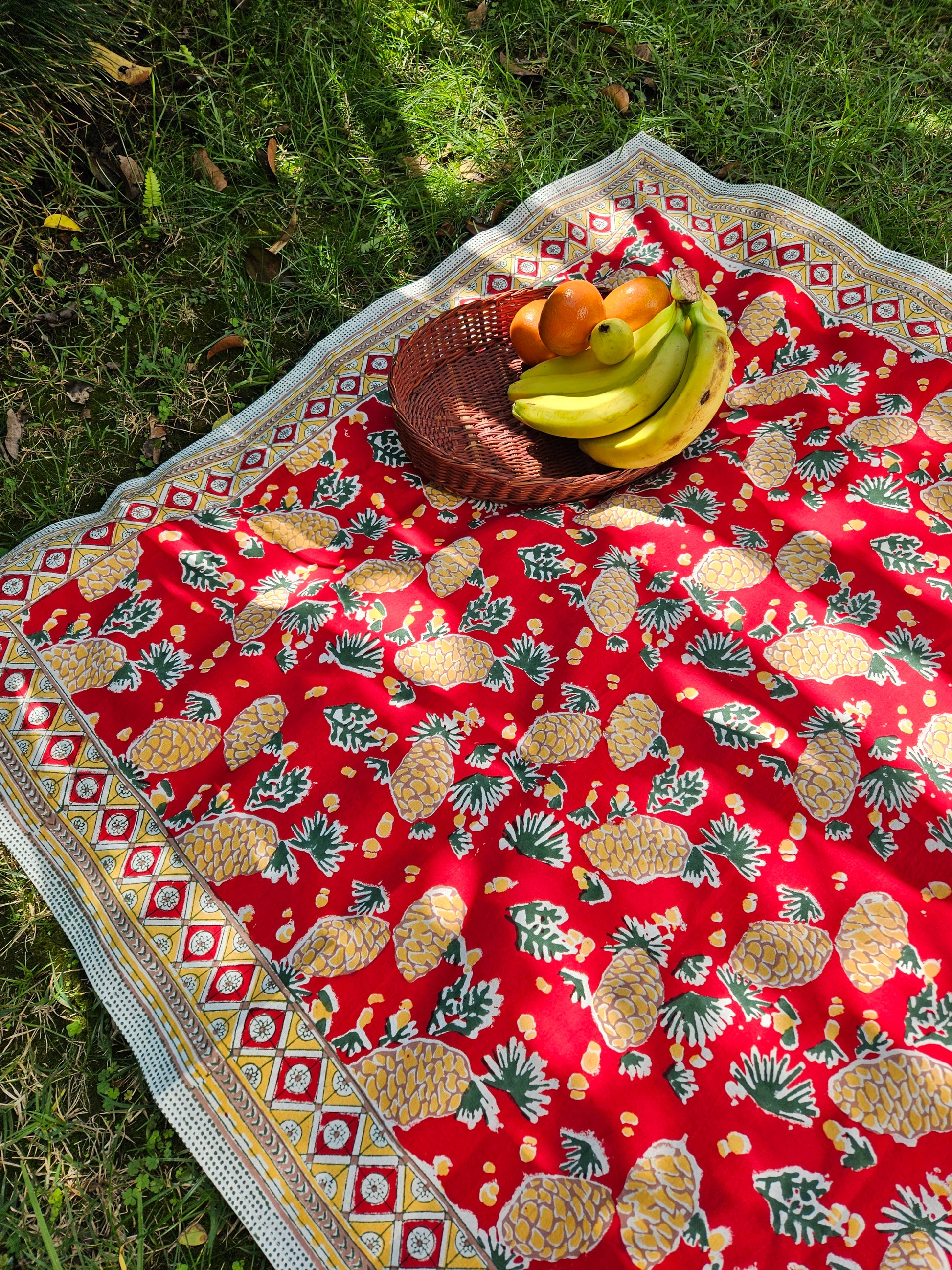Mantel cuadrado 100% algodón estampado a mano. Piñas en rojo
