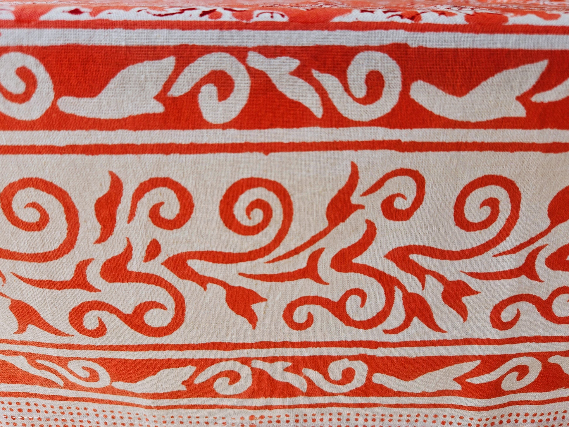 Precioso mantel estampado a mano con brillantes colores. Este mantel está estampado usando la antigua técnica de sellos de madera. El trabajo es completamente a mano y sigue una tradición de más de 4000 mil años. Un arte en extinción cuyos resultados son únicos y espectaculares.