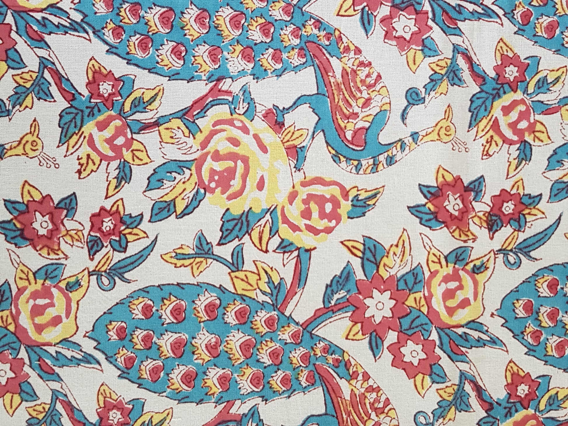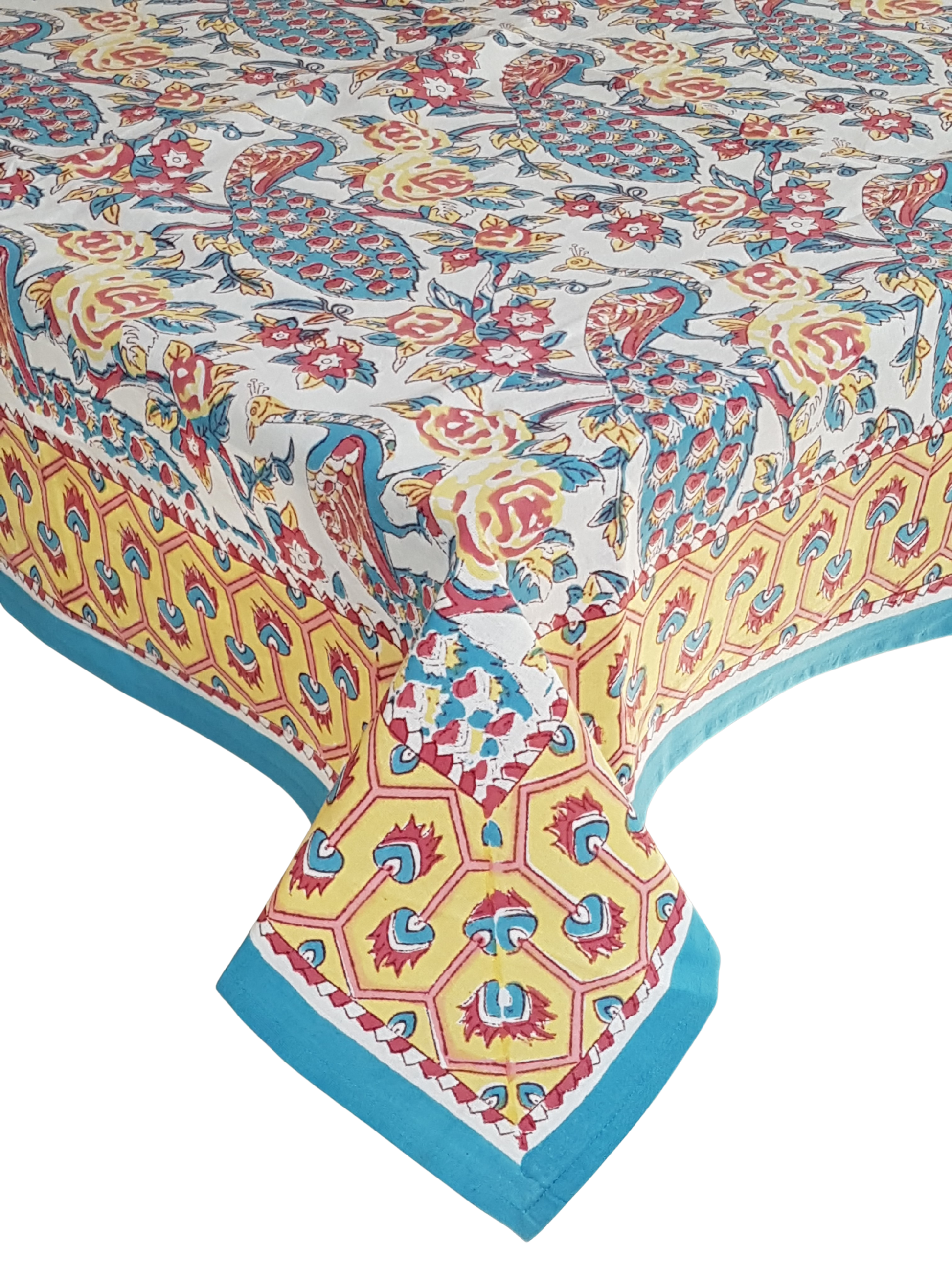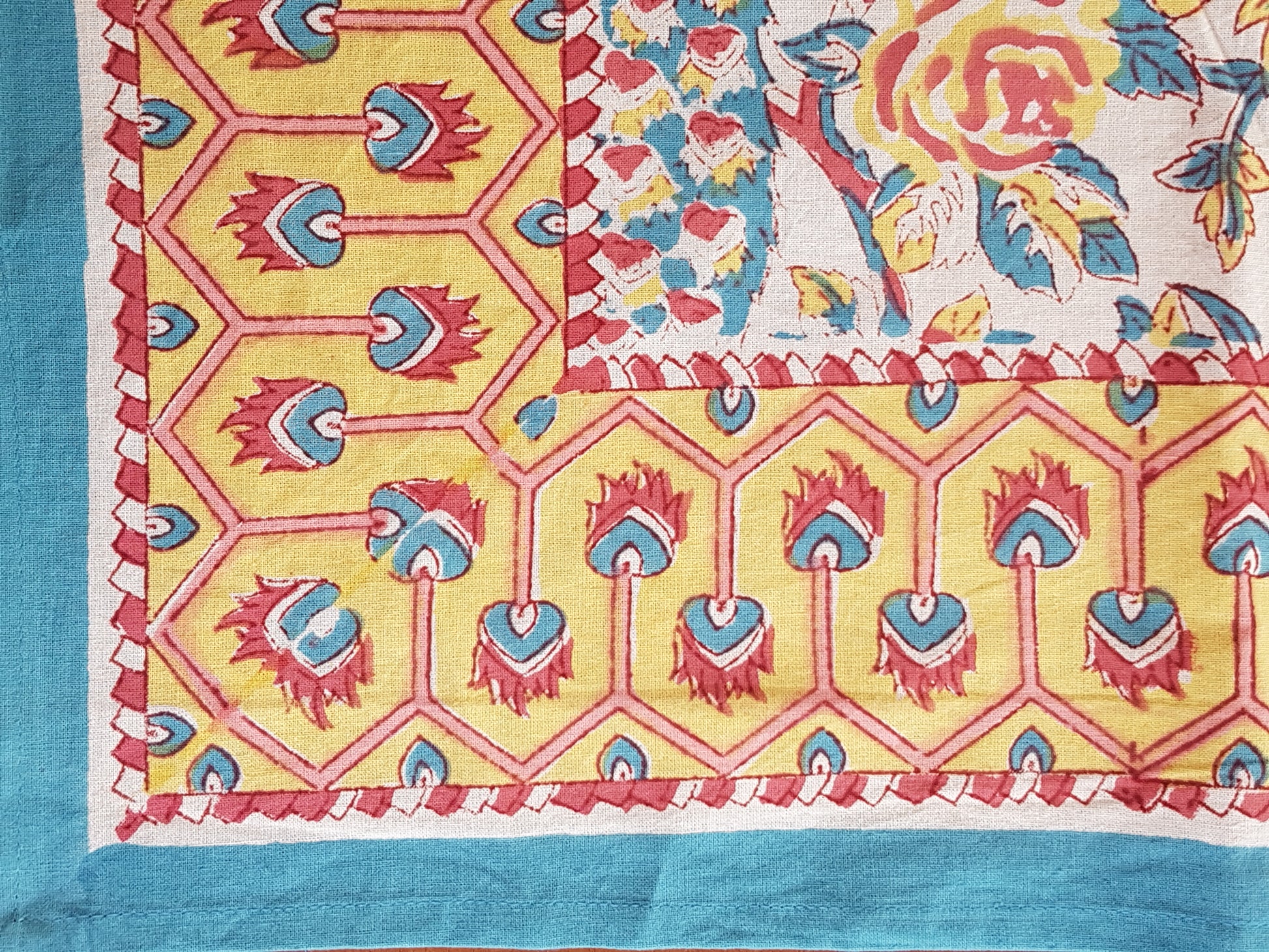 Precioso mantel estampado a mano con brillantes colores. Este mantel está estampado usando la antigua técnica de sellos de madera. El trabajo es completamente a mano y sigue una tradición de más de 4000 mil años. Un arte en extinción cuyos resultados son únicos y espectaculares.