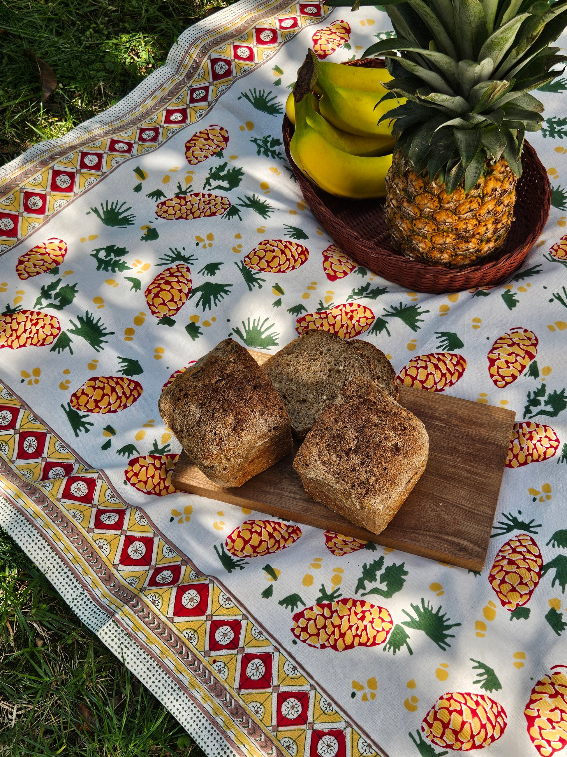 Mantel cuadrado Piñas en blanco. Estampado a mano