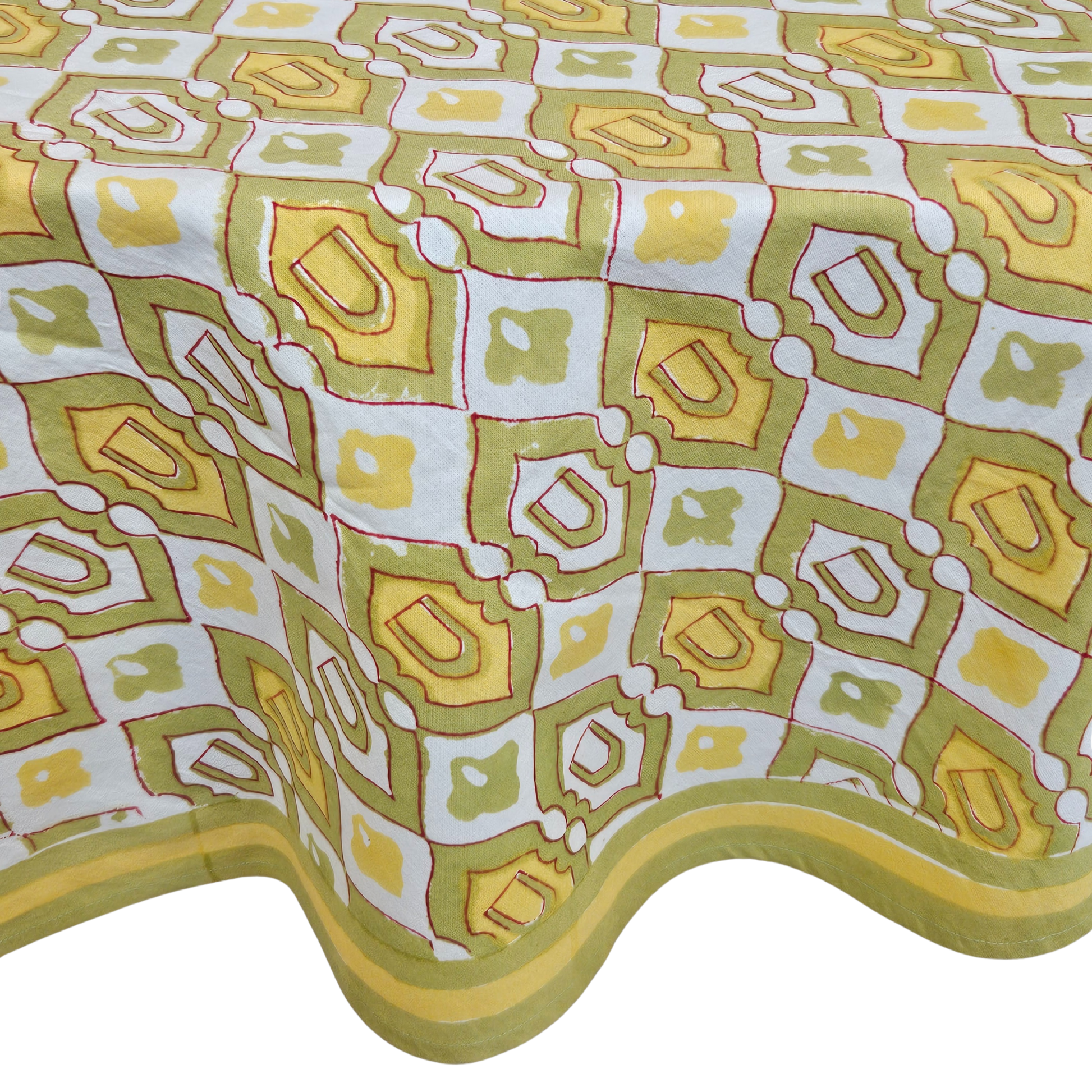 Precioso mantel estampado a mano con brillantes colores. Este mantel está estampado usando la antigua técnica de sellos de madera. El trabajo es completamente a mano y sigue una tradición de más de 4000 mil años. Un arte en extinción cuyos resultados son únicos y espectaculares.