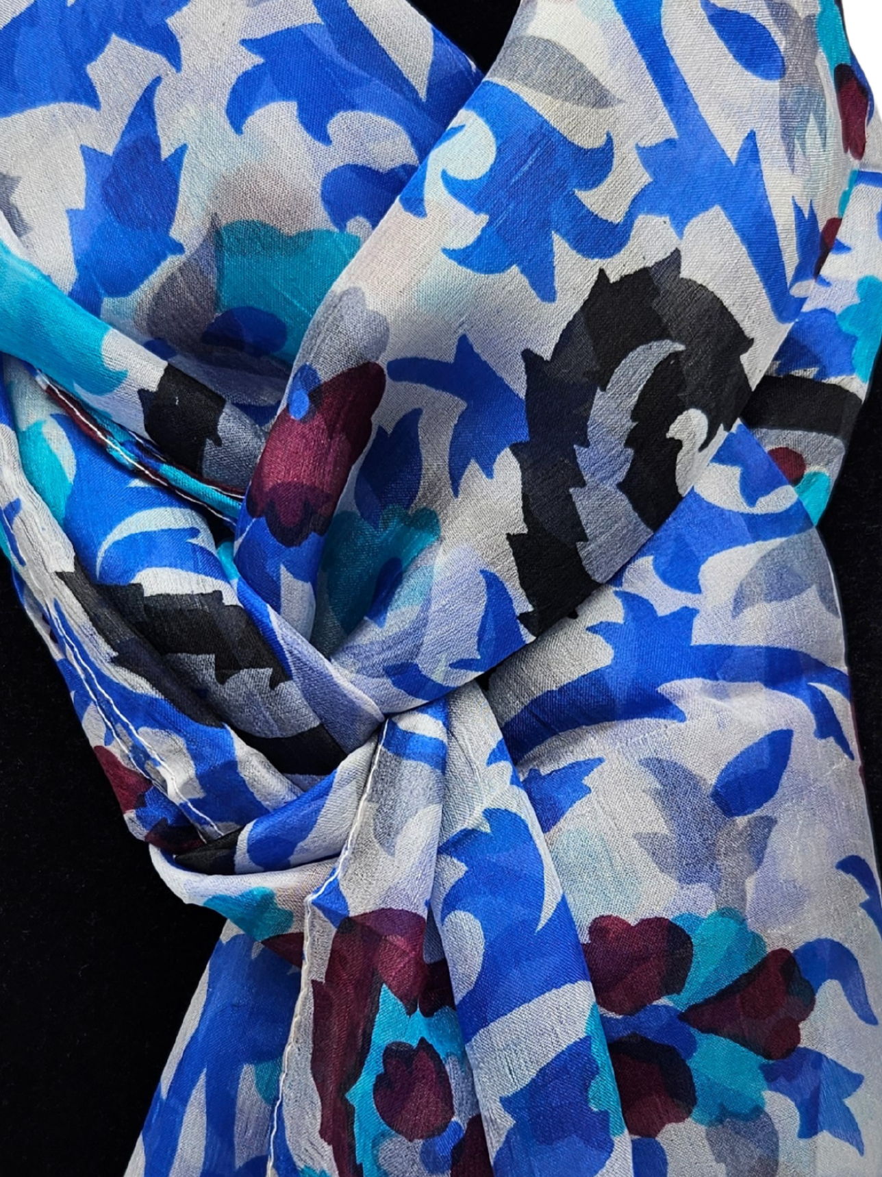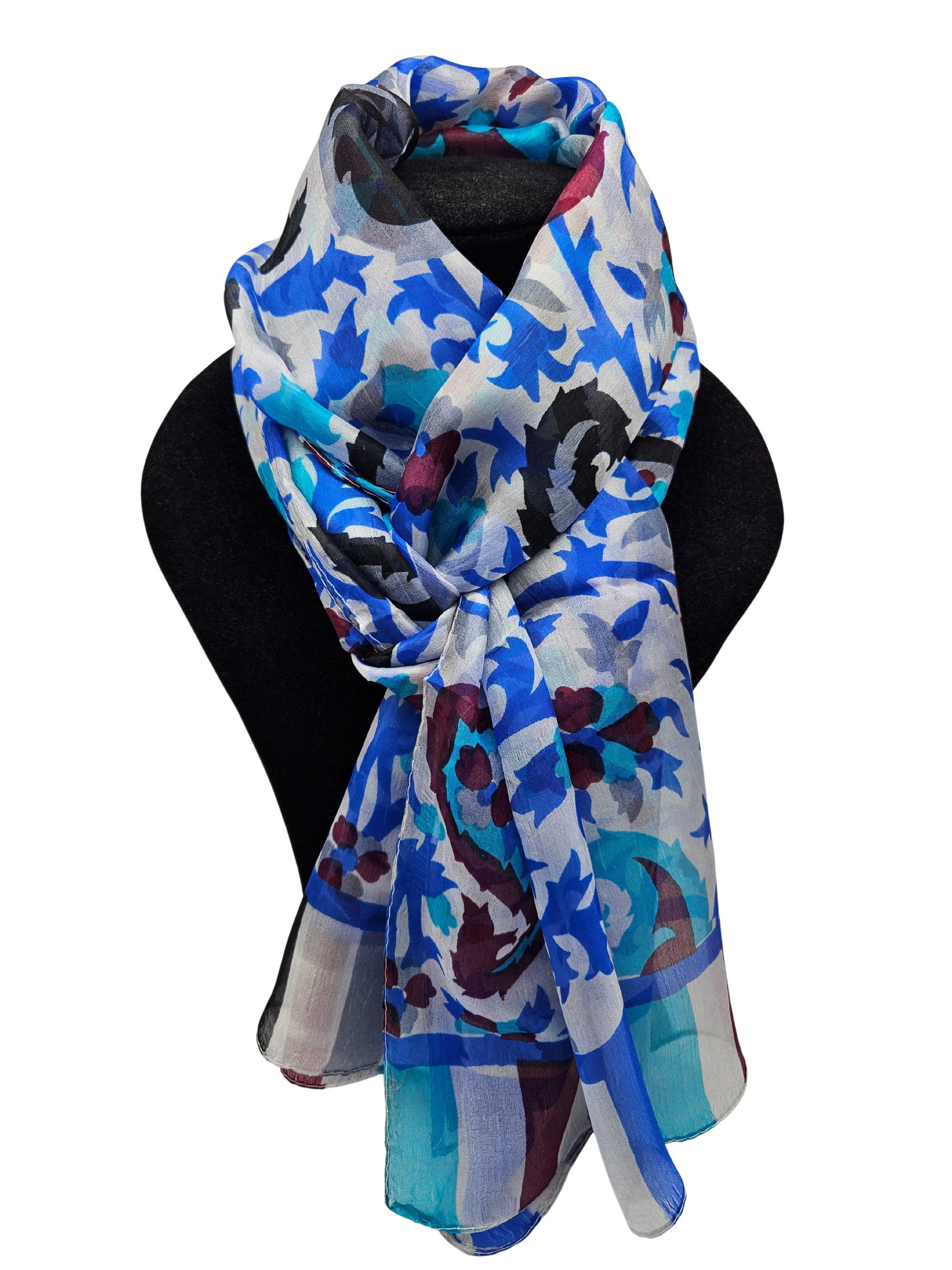 Mascada de seda estampada. Azul fondo blanco