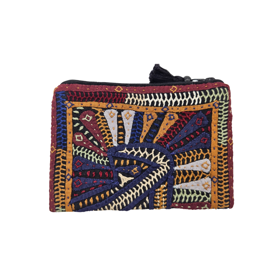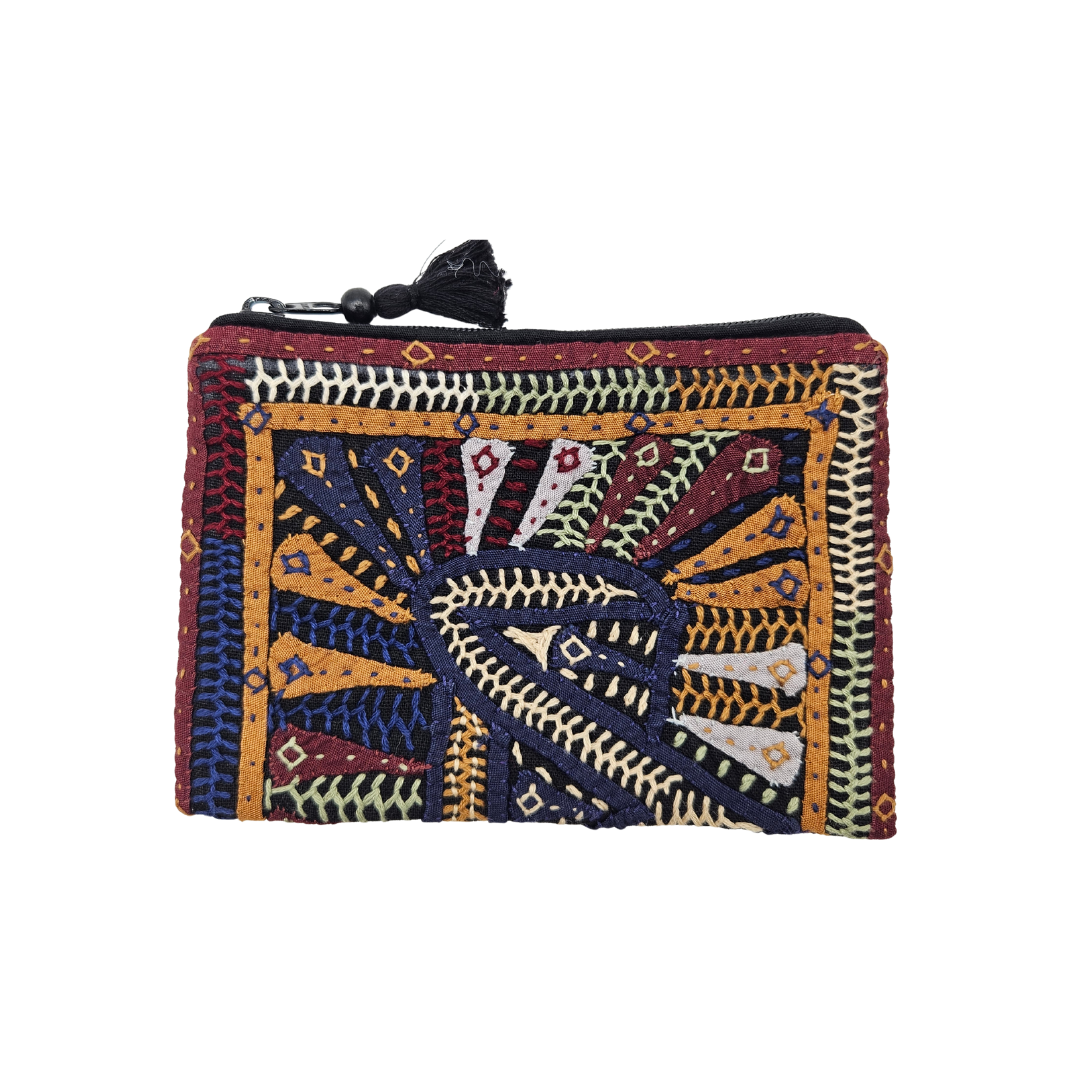 Este precioso monedero bordado hindú, con aplicaciones de tela está hecho a mano por las artesanas del distrito de Kutch en el estado de Gujarat, India.