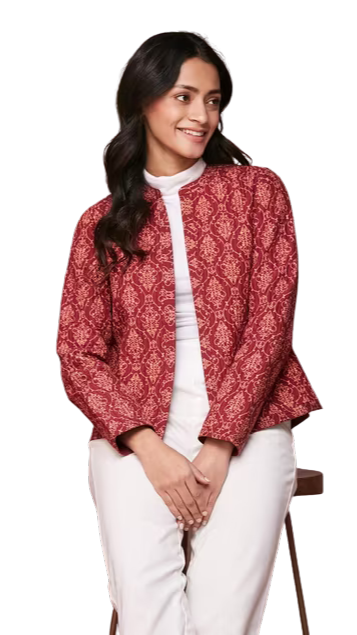 Este saco de algodón en combinación con la novedosa fibra lyocel, estampado a mano con sellos de madera te ofrece un estilo clásico y elegante. Está hecho en la India y está acolchado a todo lo largo.